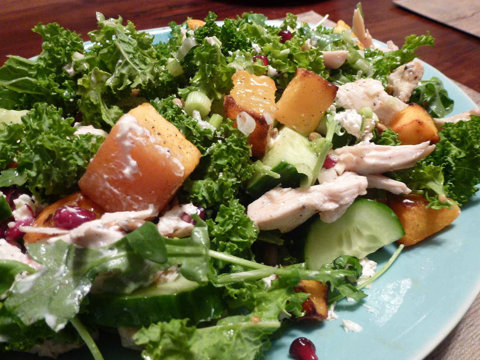 Butternut squash, pomegranate seeds, kale, pumpkin seeds & chicken with homemade dressing.